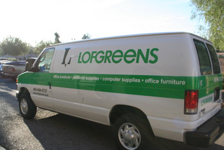 Located at 535 West Iron Avenue in Mesa, Lofgreen’s is the premier provider of office products and furniture, computer as well as janitorial supplies. Promising next-business-day delivery within the company’s local trade area, Lofgreen’s trucks are frequent sights on the roads. When it came time to add Ford E150 van graphics and vinyl lettering, Mesa, AZ, office supply specialists Lofgreen’s contacted Spotlight Signs and Imaging Solutions.