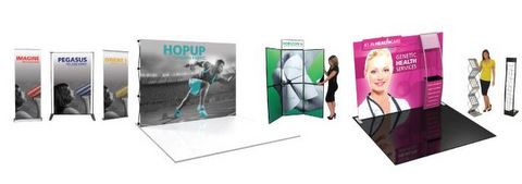 - Retractable banner stands. These are the workhorses of the trade show circuit. Designed to add splashes of color, generate name recognition and increase branding effectiveness, there is a wide variety of models and sizes that suit all budgets and spaces. Lightweight and durable, these stands are a snap to set up and take down.