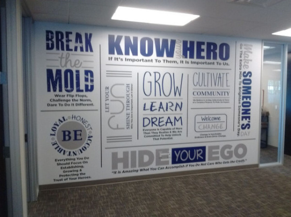 - Educational images and lettering combinations. When your firm is involved in community projects or volunteerism, put together a wall graphics collage that educates visitors to your office about the efforts you undertake, the organizations you support, and the innovative programs you champion. Doing so highlights the values that you and your customers share which, as you might guess, is all part of your greater brand message.