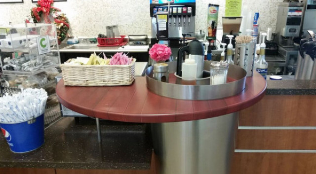 Table and Counter tops. We designed, manufactured and installed counter top wraps that mimic the look of exotic wood. We did the same for the tops of the freezer and serving table. Printed on vinyl and covered with a matte laminate, this setup provides a durable and easy-to-clean surface that instantly modernizes the feel of the locale.