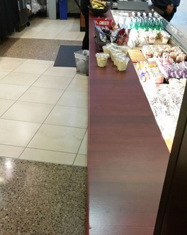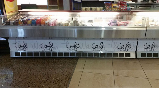 Wall banner stripe. Our experts designed a black print on a white background, thin banner stripe that we then installed on the wall just underneath the ceiling. It goes along the entire wall. The product spells out words such as “snacks,” “water” and “sandwiches.” By encircling the walls of the restaurant with this look, it sets the tone for customer expectations.