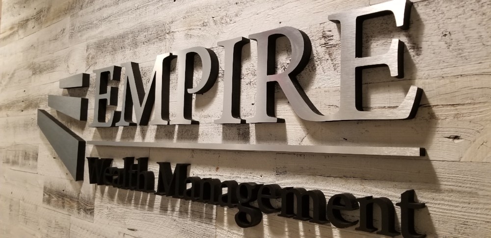For their lobby signage we used a combination of the styles that are displayed above. The Gatorfoam sign features their icon and their company name. For this sign, the icon and “EMPIRE” were done with brushed silver lamination and the “Wealth Management” portion was done with matte black. The matte black of the subtext matches wonderfully with the visible black returns on the sides of the “EMPIRE” Gatorfoam.