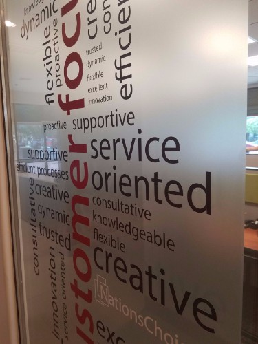 When your facilities have many mirrors, you can improve boring, cheap mirrors with etched vinyl. Give window panes throughout your building the same treatment. You can boost the overall look of your office by adding distinguished etching. Another great alternative is to display the names of executives on their office doors using frosted vinyl lettering. As people leave the company or change positions, it is easy to replace the vinyl.