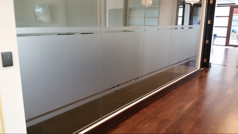 We created a series of horizontal custom-etched vinyl bands that we carefully situated onto the glass panes for optimal privacy and the creation of a professional look. Although they do not display a company logo or name, they nevertheless succeed at branding the business with a sophisticated appearance.