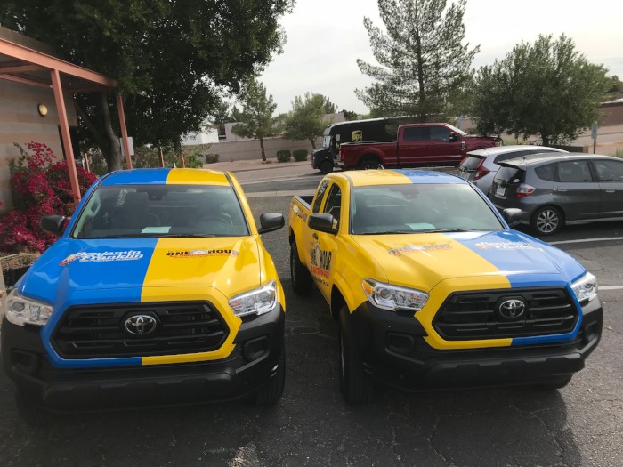 Vehicle fleet wraps work wonders for brand awareness and reputation. Not only do vehicle wraps reach a staggering average of 9 million pairs of eyeballs a year, they also impress. Car wraps give the impression of a brand that is well run and organized, they make a business feel more trustworthy. Our recent Phoenix area client was in the unusual situation of having two separate brands to promote with his new fleet of sales vehicles for Mesa, Tempe, Gilbert, and Chandler, AZ. It was a challenge to produce a wrap that effectively represented two brands while still looking good as a whole. These wraps are vehicle fleet wrap promotion double dipping! They promote two brands at once and do so in style.