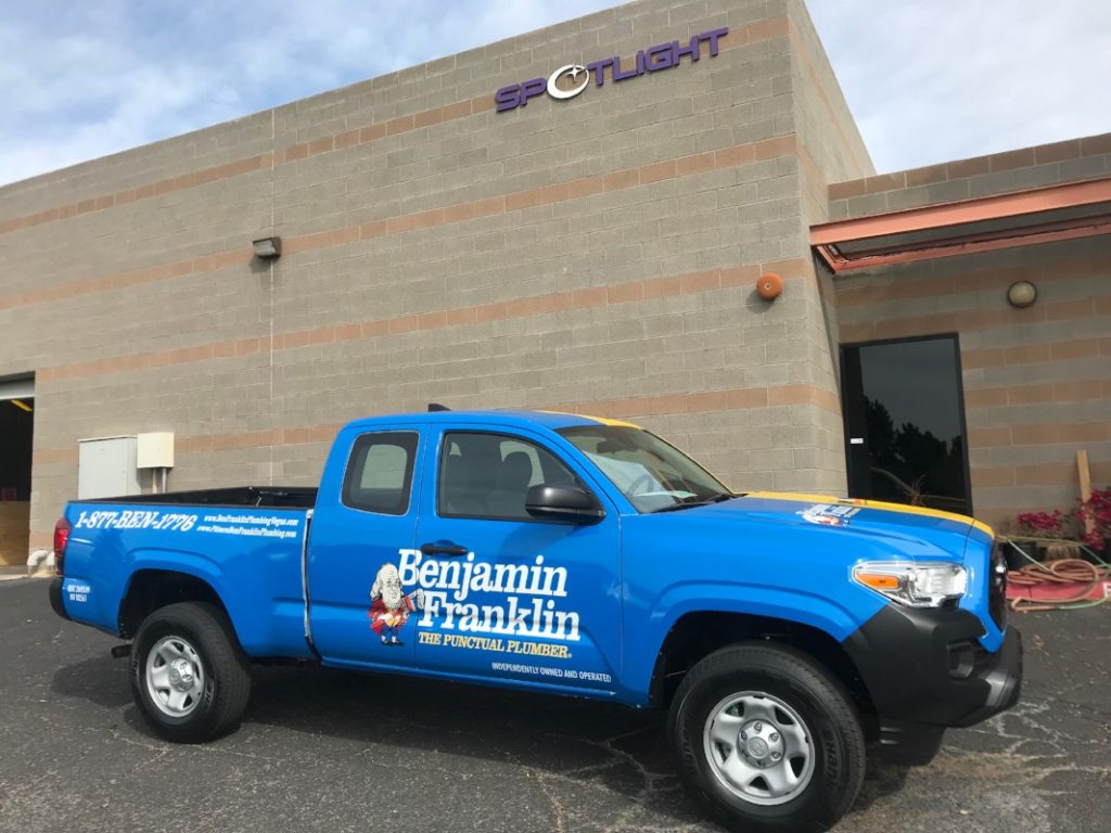 Benjamin Franklin, The Punctual Plumber and One Hour Heating & Air Conditioning are two distinct franchises specializing in different areas of home maintenance. Our client, who owns both franchises, was looking for a way to promote both simultaneously with his new sales vehicle fleet wraps. They decided on a “half and half” design that splits the car into vibrant yellow and a bright blue parts. These colors were very important to the client, they had to be right and they had to be eye-catching.