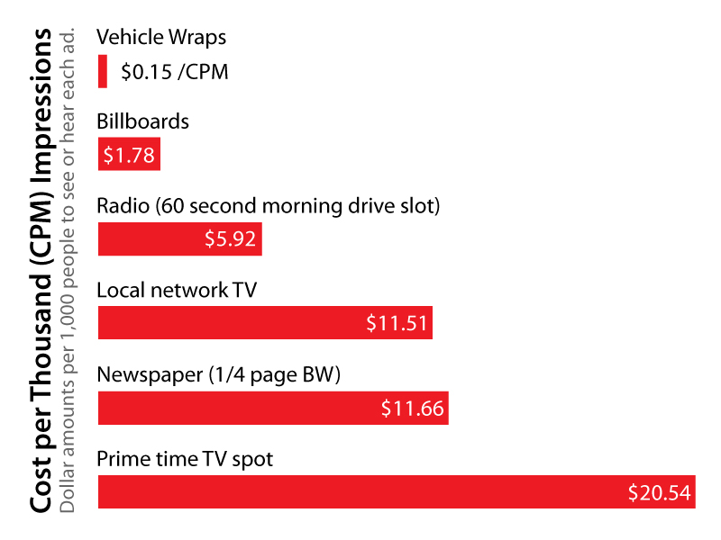 Car graphics and vehicle fleet wraps are a very effective form of advertisement. A popular metric for advertisement is price per impression – which is the breakdown of the cost of each pair of eyeballs that you get on your advertisement. According to the Outdoor Advertising Association of America, at $0.15/1000 impressions, vehicle wraps are by far the most cost effective form of advertisement. Others estimate this figure to be as low as $0.04!